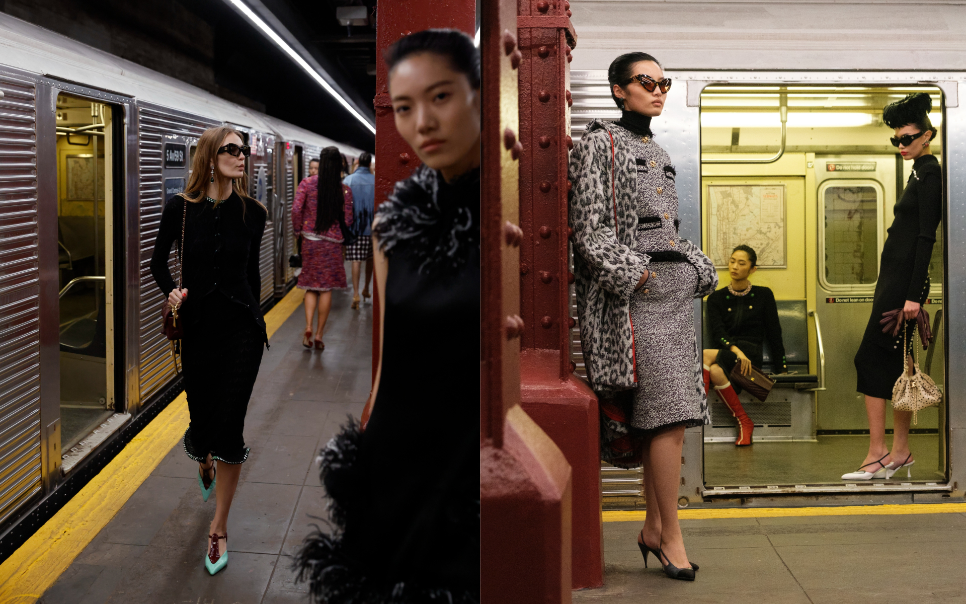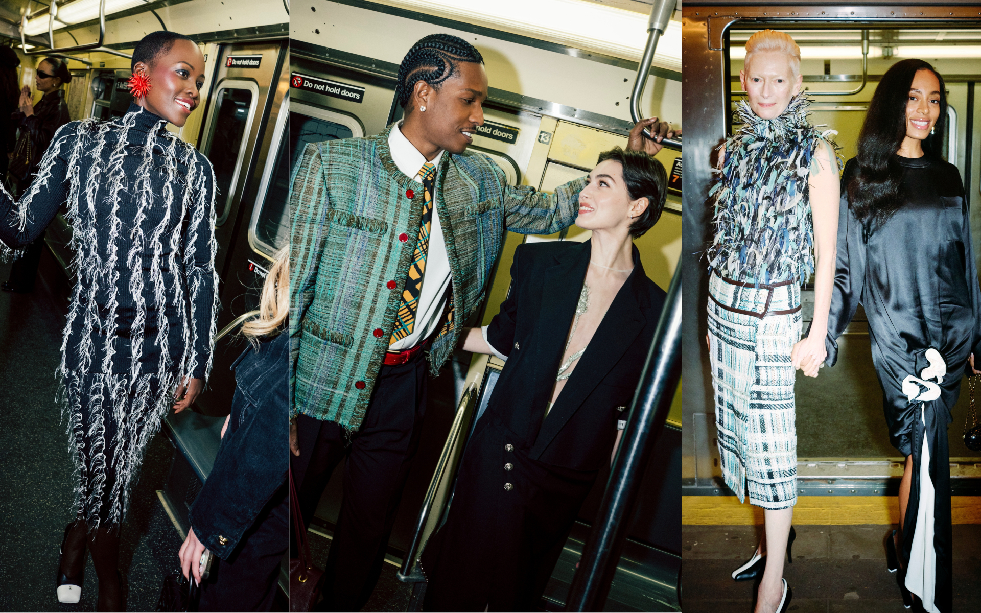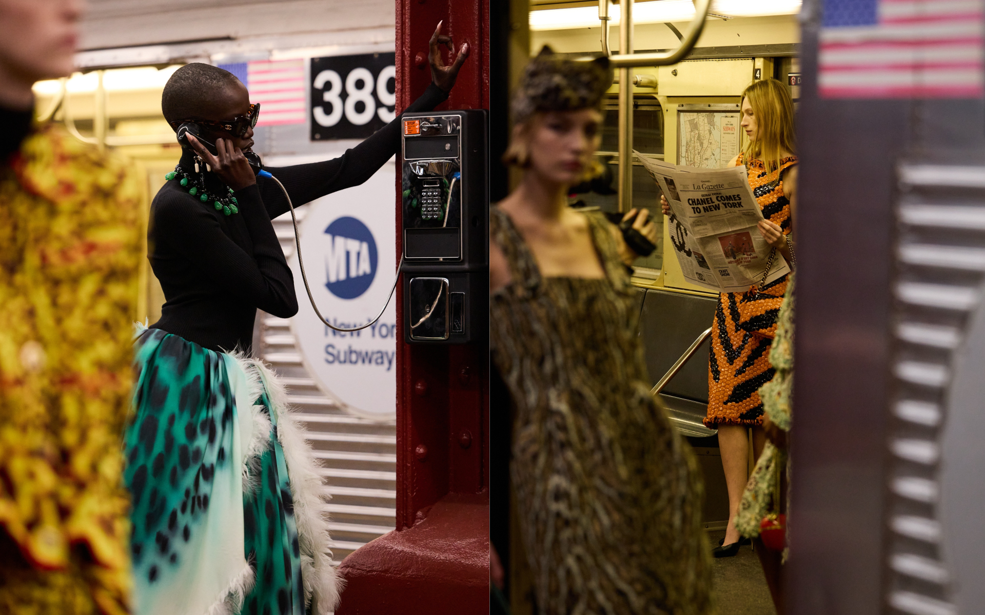 Encore plus exotique que Hangzhou en Chine ou Manchester ? Une station désaffectée du métro new yorkais, décor choisi par Matthieu Blazy pour son côté à la fois pittoresque et accessible. “Durant ces années, j’ai pris beaucoup le métro (à New York, ndlr) et j’y ai vu des scènes extraordinaires, raconte le designer franco-belge aux journalistes après le show. Je me souviens d’une fois, à Times Square, où Spiderman est entré dans la rame. Ou encore d’un soir, quand, en rentrant d’un spectacle à l’Opéra, je me suis retrouvée dans la rame avec d’autres spectatrices habillées dans leurs robes de soirée incroyables. Le métro de New York est un endroit sans hiérarchie, où les strates sociales s’effacent, où l’on peut rencontrer un étudiant comme une femme qui va diriger le monde entier.” Alors que les mannequins déambulent sur les quais et dans les rames, qu’elles lisent la gazette Chanel ou passent des coups de fil des cabines téléphoniques, les invité·e·s du défilé s’extasient aussi devant tant d’exotisme, en se prenant notamment en photo devant les tourniquets. Le métro new yorkais et ses nombreuses références au cinéma semblent donc être le lieu idéal entre rêve américain et parti pris social (Zohran Mamdani aurait activement fait campagne dans les tunnels souterrains).