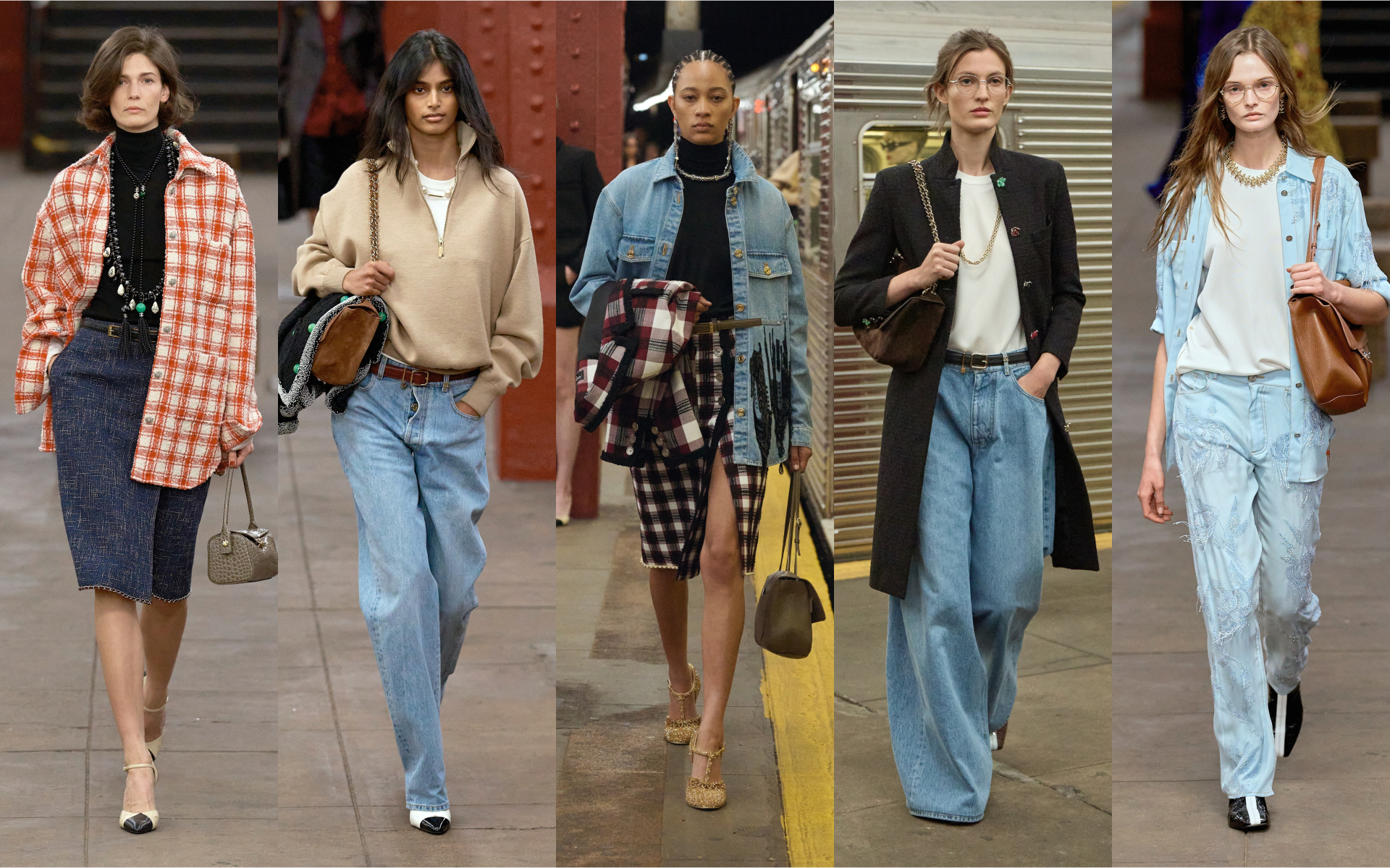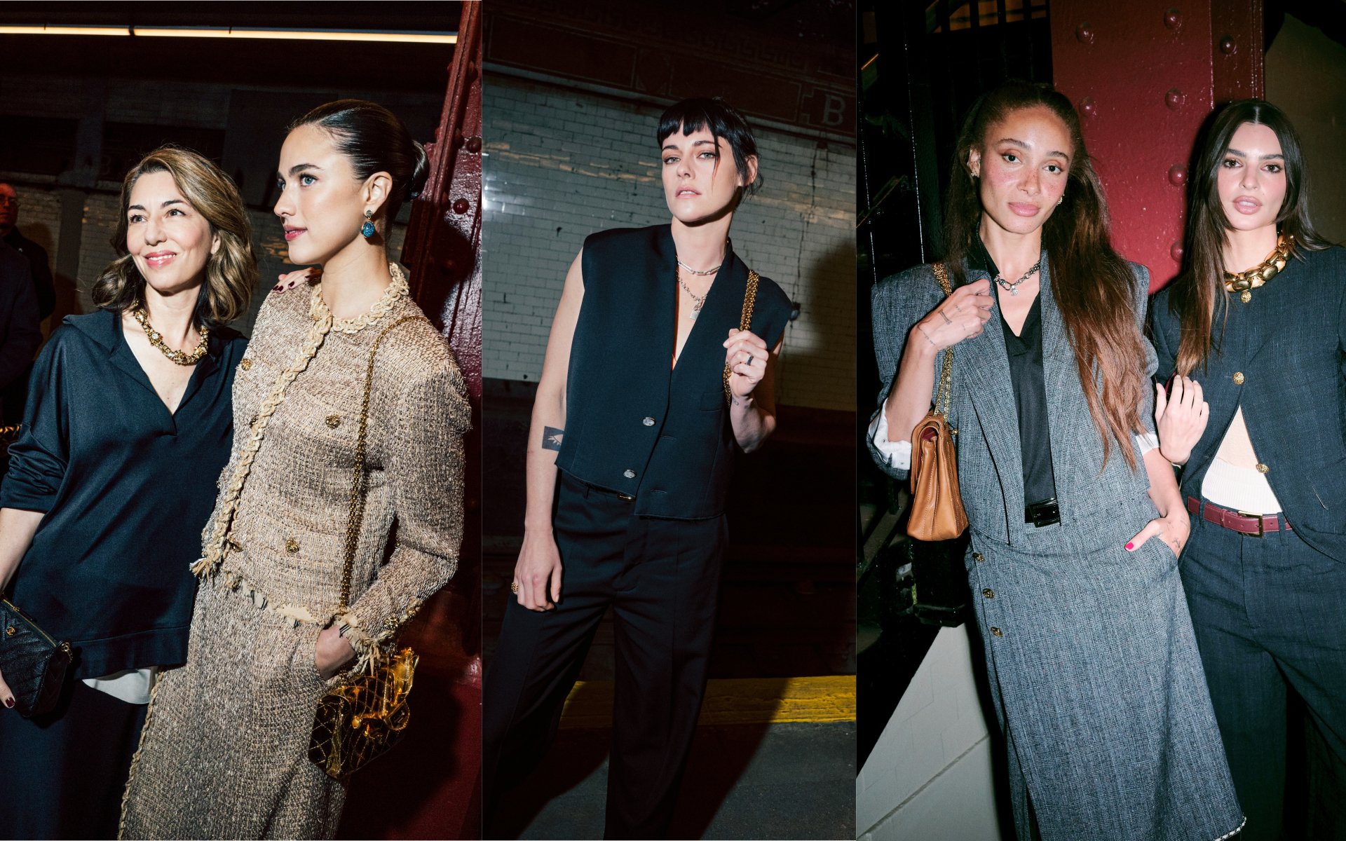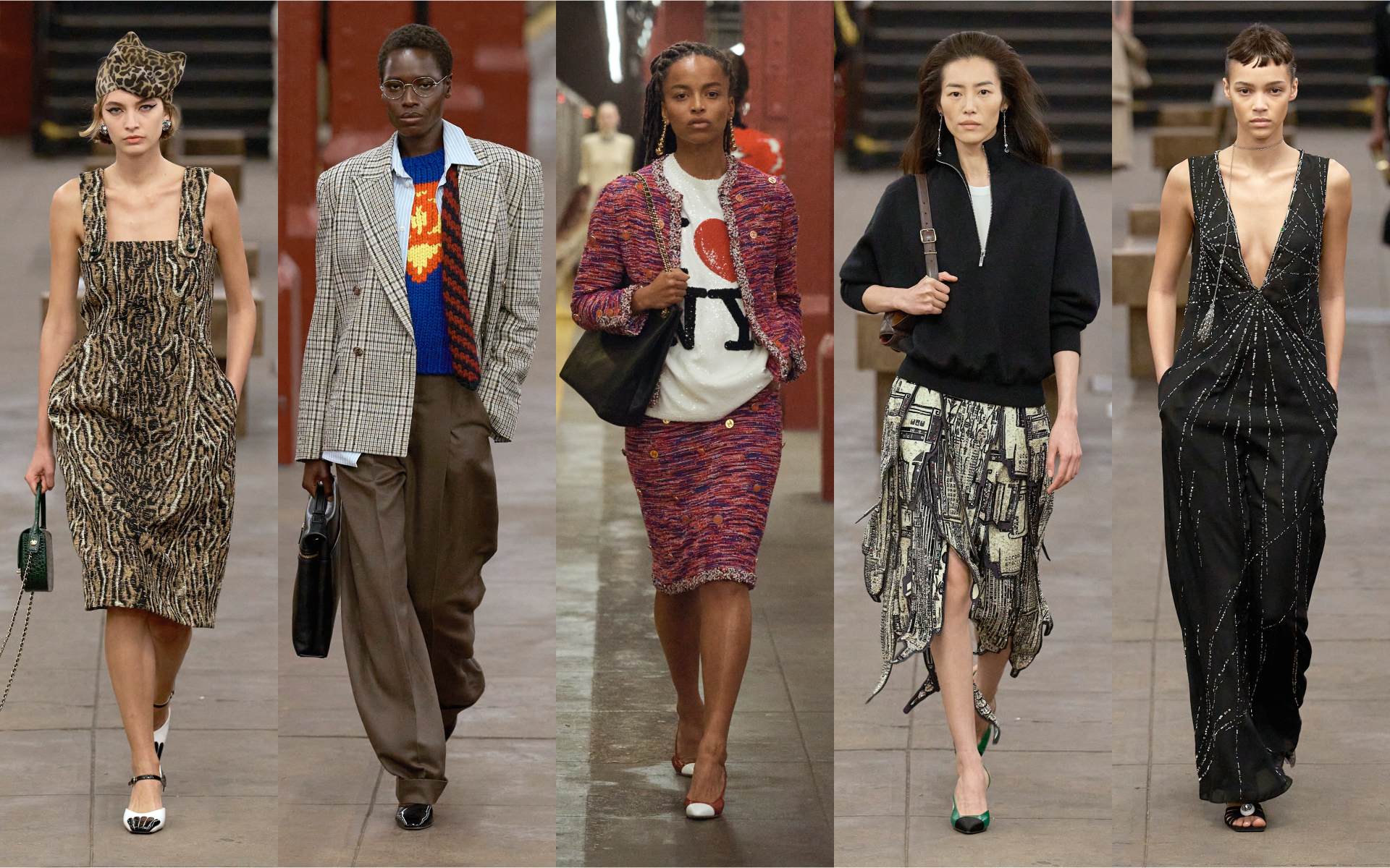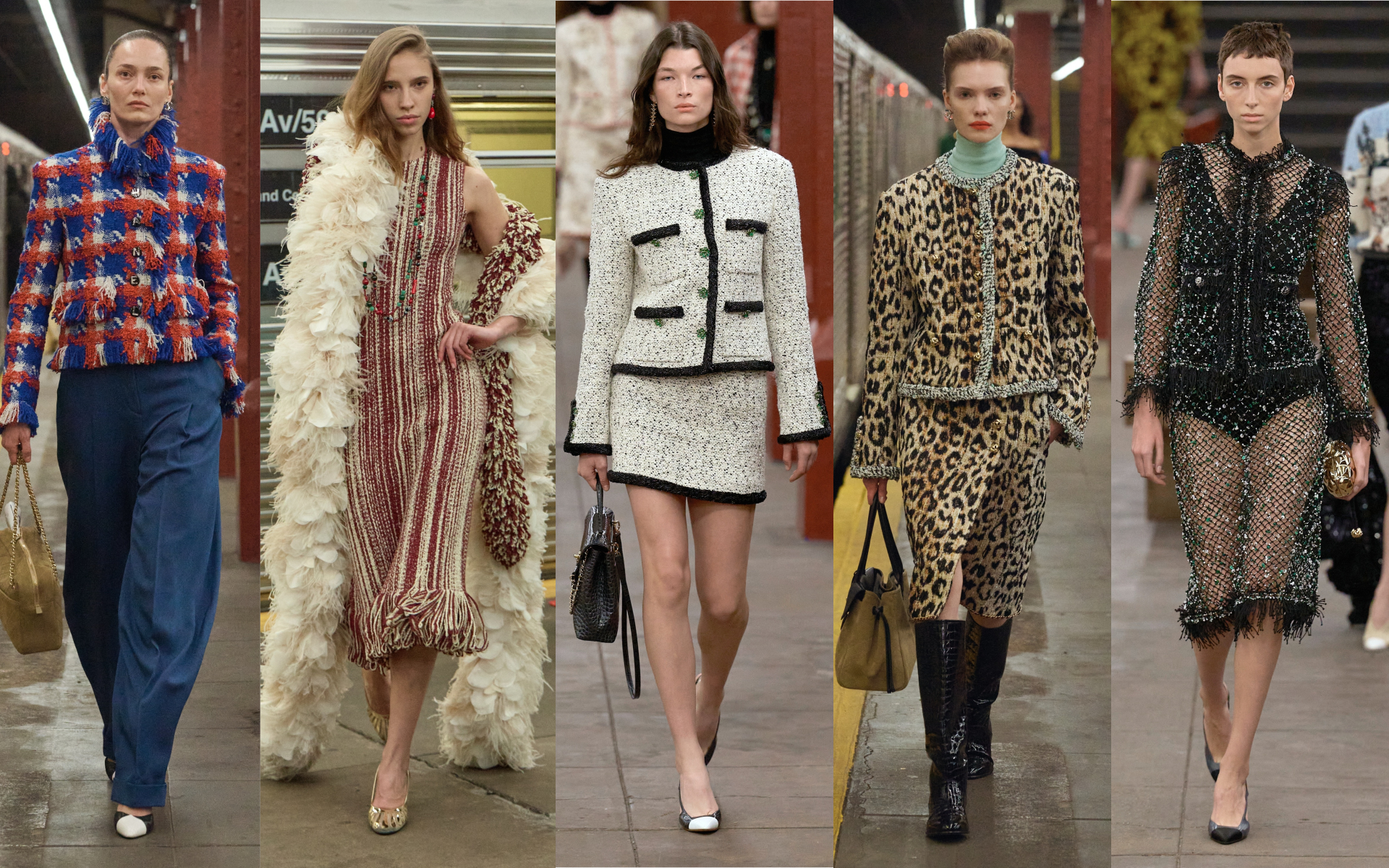 Encore plus exotique que Hangzhou en Chine ou Manchester ? Une station désaffectée du métro new yorkais, décor choisi par Matthieu Blazy pour son côté à la fois pittoresque et accessible. “Durant ces années, j’ai pris beaucoup le métro (à New York, ndlr) et j’y ai vu des scènes extraordinaires, raconte le designer franco-belge aux journalistes après le show. Je me souviens d’une fois, à Times Square, où Spiderman est entré dans la rame. Ou encore d’un soir, quand, en rentrant d’un spectacle à l’Opéra, je me suis retrouvée dans la rame avec d’autres spectatrices habillées dans leurs robes de soirée incroyables. Le métro de New York est un endroit sans hiérarchie, où les strates sociales s’effacent, où l’on peut rencontrer un étudiant comme une femme qui va diriger le monde entier.” Alors que les mannequins déambulent sur les quais et dans les rames, qu’elles lisent la gazette Chanel ou passent des coups de fil des cabines téléphoniques, les invité·e·s du défilé s’extasient aussi devant tant d’exotisme, en se prenant notamment en photo devant les tourniquets. Le métro new yorkais et ses nombreuses références au cinéma semblent donc être le lieu idéal entre rêve américain et parti pris social (Zohran Mamdani aurait activement fait campagne dans les tunnels souterrains).
