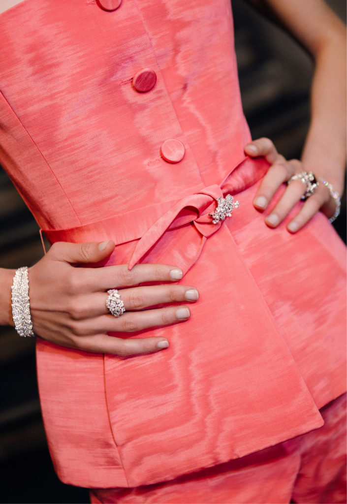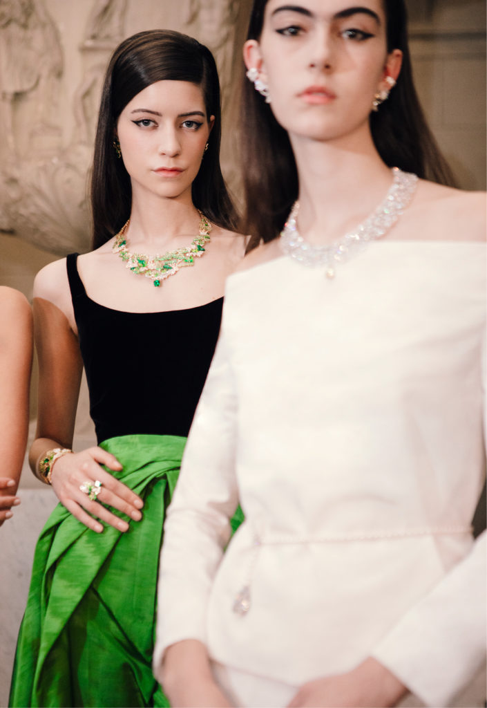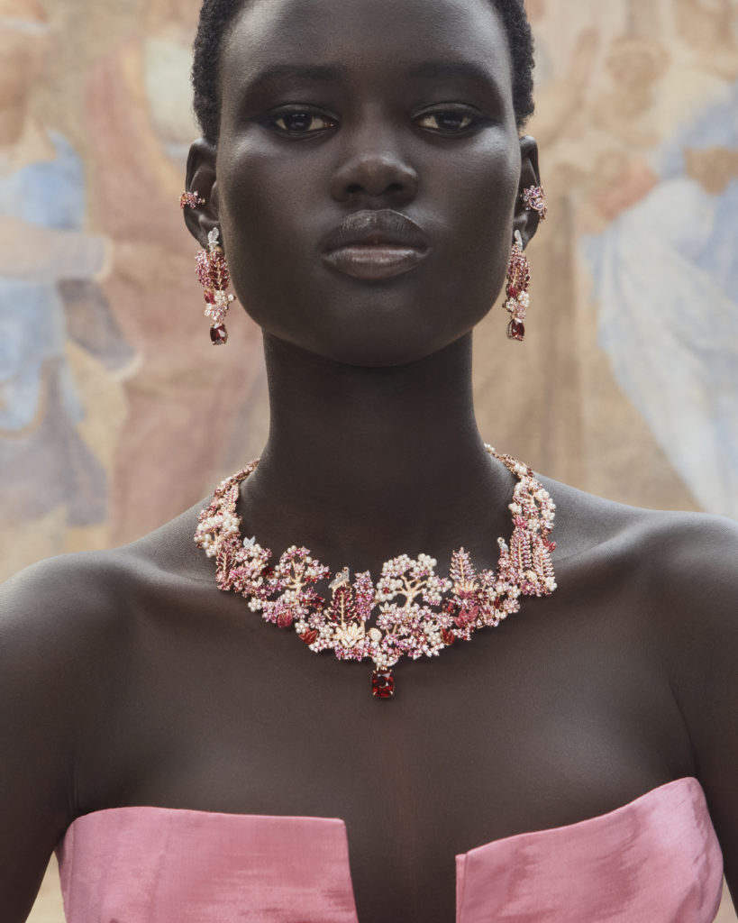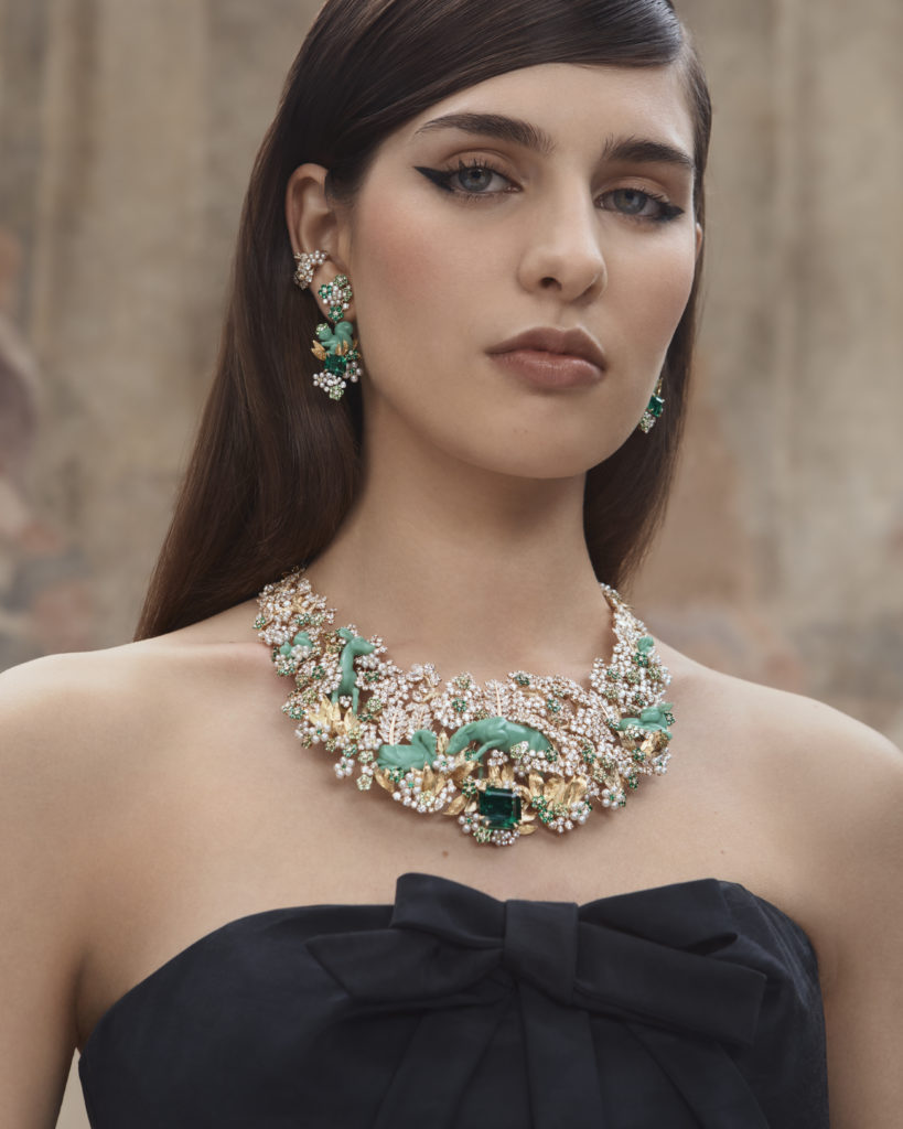 Écureuils, cygnes, lapins, chouettes, biches et végétation luxuriante, la collection est une promenade dans le jardin de Milly-la-Forêt, ponctuée de rubis, de saphirs et de diamants, autant de pierres travaillées par la glyptique, une méthode consistant à graver ou sculpter des pierres précieuses. Et qui dit monde végétal dit émeraude, ici sublimée par la masterpiece, le collier Diorama et Diorigami en or jaune et or blanc, diamants, émeraudes, saphirs jaunes, grenats tsavorites, perles de culture blanches et chrysoprases, habité par toute une faune fantasmée.