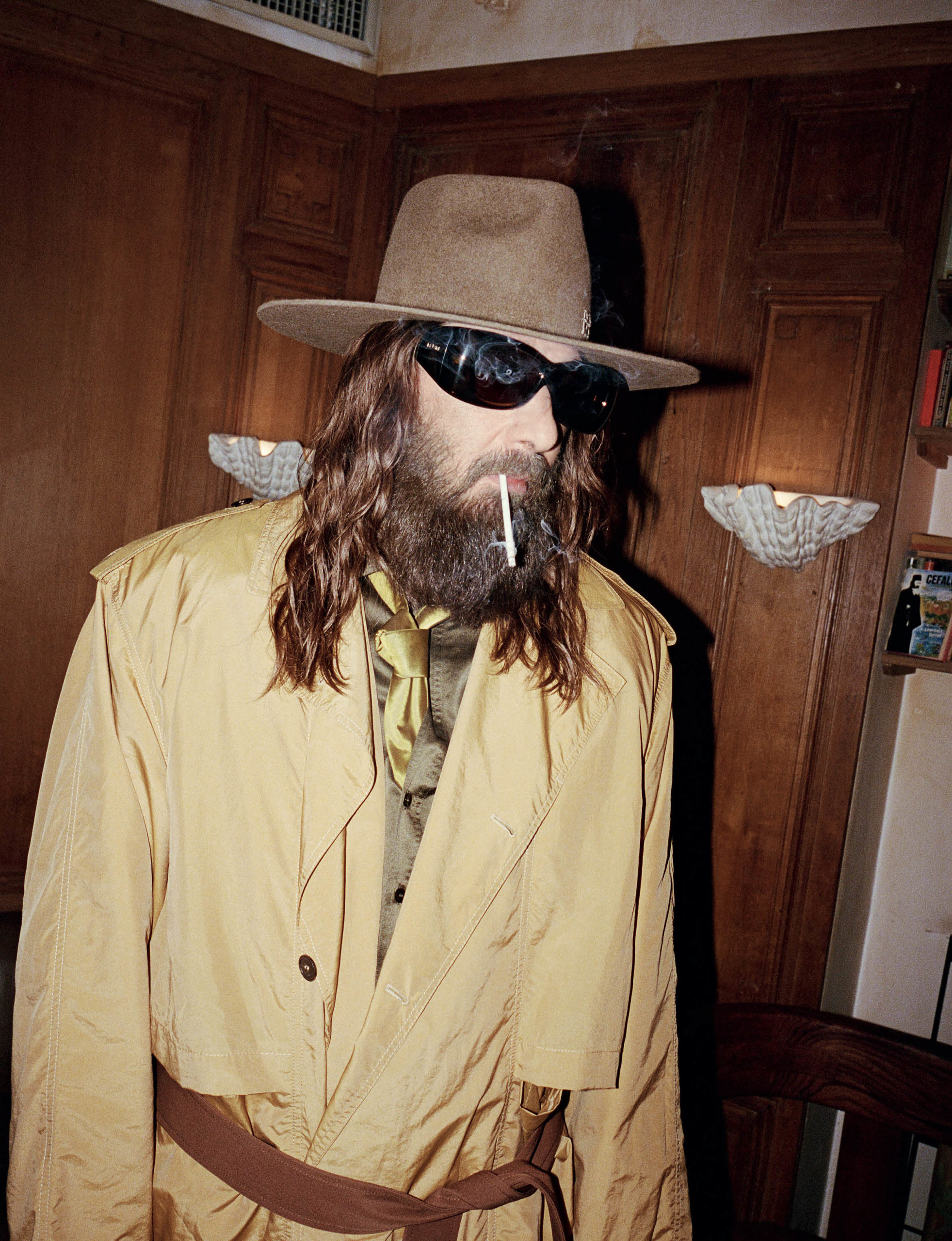 TRENCH, CHEMISE, CRAVATE ET LUNETTES DE SOLEIL SAINT LAURENT PAR ANTHONY VACCARELLO, CHAPEAU RUSLAN BAGINSKIY.