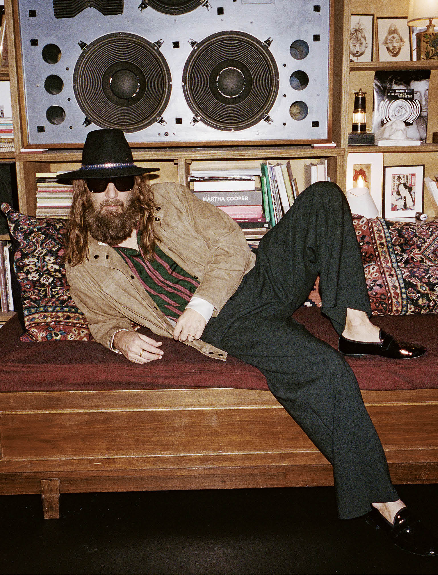 VESTE JACQUEMUS, CHEMISE GIORGIO ARMANI, PANTALON AMI PARIS, CHAPEAU MAISON MICHEL, LUNETTES DE SOLEIL SAINT LAURENT PAR ANTHONY VACCARELLO, BRACELET ET BAGUES DAVID YURMAN, MOCASSINS REPETTO, ALLIANCE PERSONNELLE.