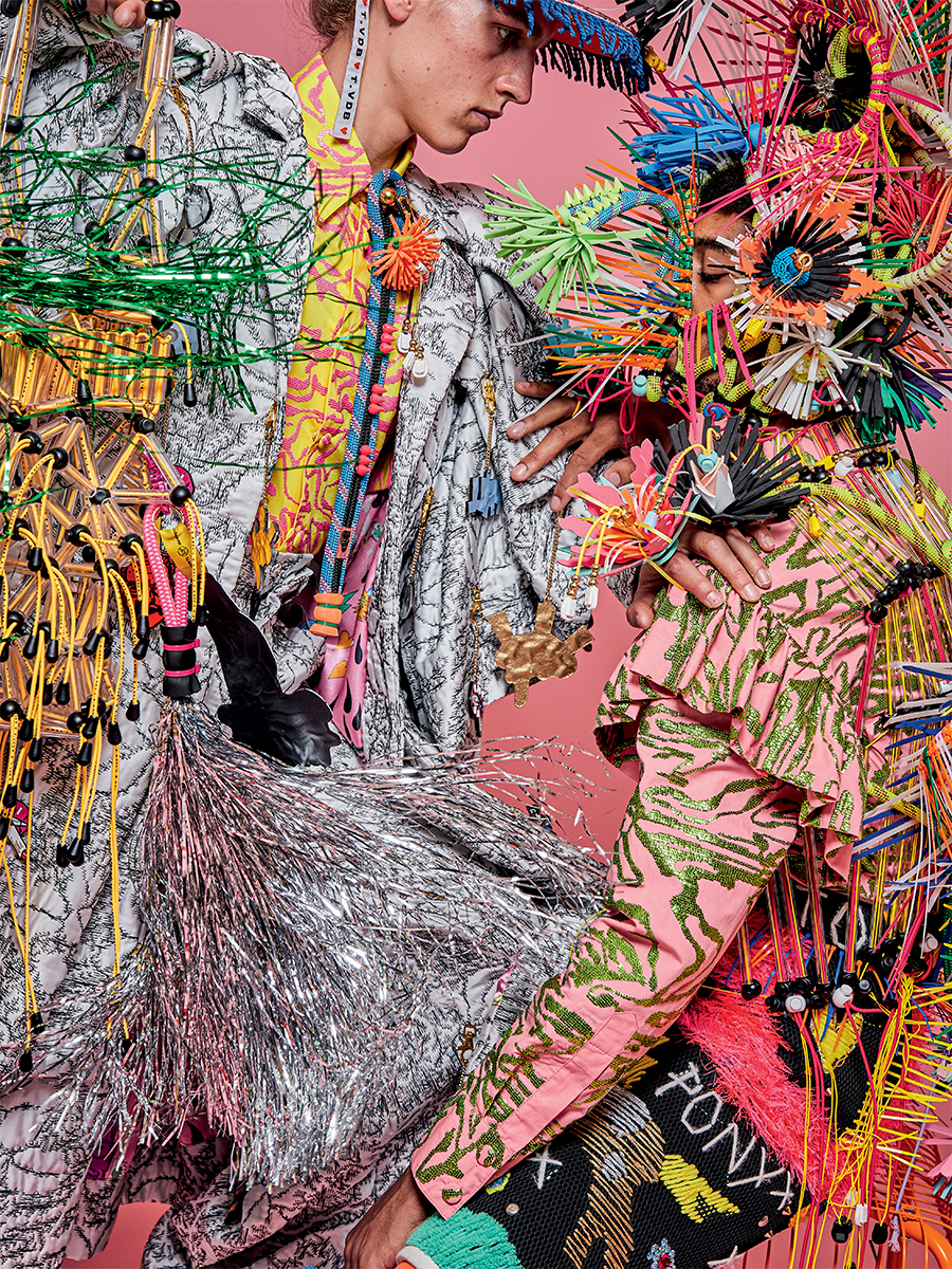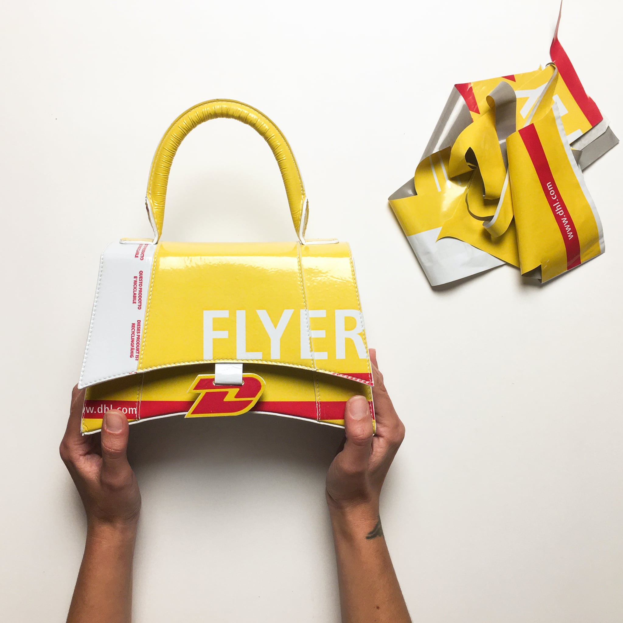 Chiara Rivituso et Matteo Bastiani, les deux designers milanais derrière Camera 60, réinterprètent des sacs à main iconiques de luxe avec des matériaux upcyclés – de la boîte de biscuits Oreo au sac Ikea en passant par l’enveloppe DHL. À la base, spécialisé dans le cuir, le duo s’est mis, pendant le confinement, à transformer des emballages, sacs et autres déchets en plastique qui auraient fini à la poubelle. C’est ainsi qu’une boîte à chaussures Nike est devenue un Saddle bag Dior et qu’un packaging McDo s’est changé en sac Fendi Baguette. Envie de savoir comment réutiliser votre boîte à pizza Buitoni ? Direction leur Insta où ils mettent des tutos à dispo. La marque SEVALI, basée à Paris, s’attaque quant à elle à des objets trouvés dans la rue en exploitant le principe de l’upcycling à fond. Le siège d’une voiture se transforme en Combishort, les tickets de métro en robe, l’enveloppe FedEx en bustier, et le matelas en manteau oversize. Avec ses créations uniques, le designer d’origine chilienne Sebastian A. de Ruffray pousse l’imaginaire au-delà de ses frontières et a d’ailleurs conquis des stars de la musique – Lisa du groupe k-pop Blackpink, Doja Cat ou encore Rosalia.